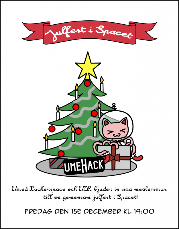 Om prick en vecka anordnar UTR och Umeå Hackerspace en gemensam julfest, vi bjuder på stämning tilltugg och sällskap! Det är frivilligt att ta med egen dryck och fika.